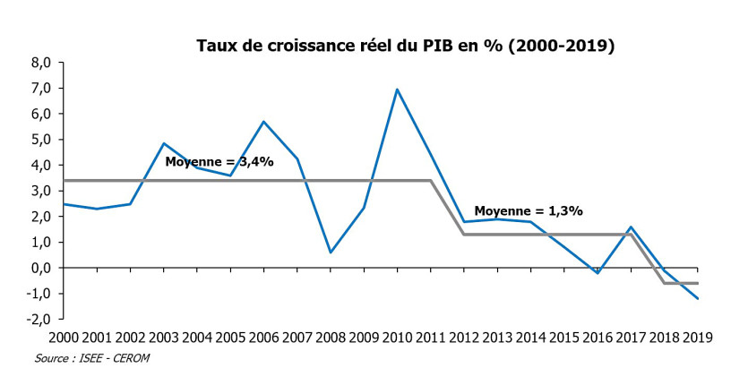 - G.C. | Crée le 22.06.2021 à 12h20 | Mis à jour le 22.06.2021 à 14h36ImprimerLa richesse produite par la Nouvelle-Calédonie, mesurée par le produit intérieur brut (PIB), a augmenté de 3,4 % par an entre 200 et 2011. La croissance a ensuite faibli. Le PIB a même diminué en 2019 et en 2020. Infographie IEOML’Institut d’émission d’outre-mer (IEOM) a présenté ce mardi matin son rapport annuel, et livré sa vision de l’évolution de l’économie calédonienne.