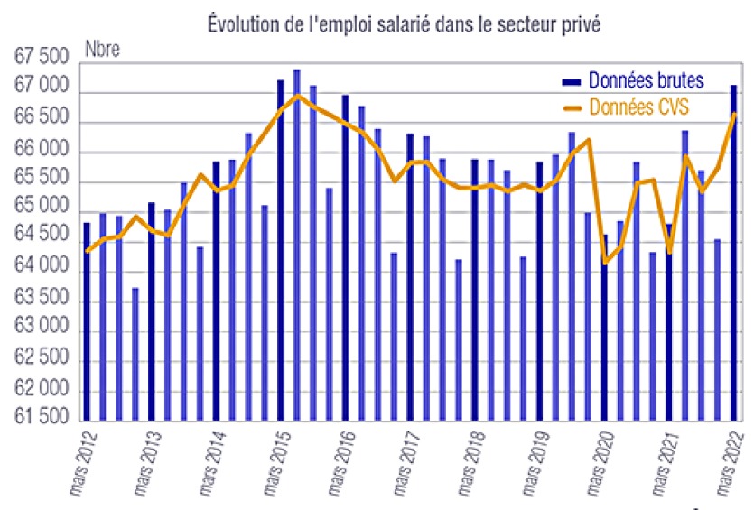 - | Crée le 31.08.2022 à 15h55 | Mis à jour le 31.08.2022 à 16h37ImprimerLe secteur privé reprend des couleurs au premier trimestre 2022. Source IseeAu premier trimestre 2022, l'emploi salarié privé confirme la reprise amorcée en décembre. Il atteint ainsi un niveau proche de son record de 2015.