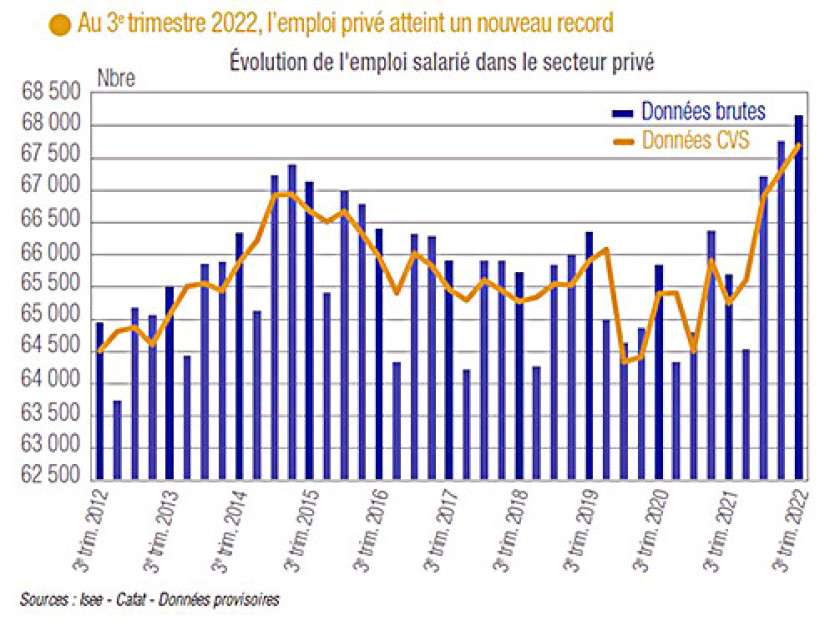 L’Isee annonce dans une publication parue ce mardi qu’au 3e trimestre 2022, 68 130 salariés sont déclarés par les employeurs du secteur privé auprès de la Cafat, soit une augmentation de 0,6 % par rapport au trimestre précédent, en données corrigées des variations saisonnières (CVS).