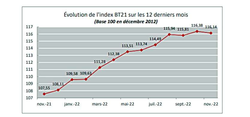 - | Crée le 19.12.2022 à 11h55 | Mis à jour le 19.12.2022 à 11h56ImprimerSur les douze derniers mois, le BT21 progresse de 8,0 %. Photo IseeLe BT21 provisoire est en repli de -0,2 % annonce l'Isee