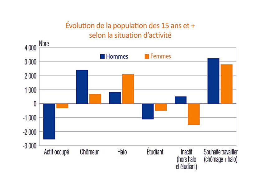 - G.C. | Crée le 26.10.2021 à 18h45 | Mis à jour le 26.10.2021 à 19h04ImprimerLe chômage a fortement progressé en 2020, sous l’effet de la crise sanitaire. Infographie IseeSans surprise, l’année 2020 a été mauvaise du côté de l’emploi, dit la dernière publication de l’Isee, diffusée mardi soir. Le taux de chômage s’élevait à 10,7 % l’année précédente, il a bondi de 2,6 points.