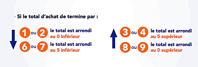 - Lorsque le paiement se fait en espèces, la règle d’arrondi s’applique sur le montant total de l’achat si le client n’a pas l’appoint.