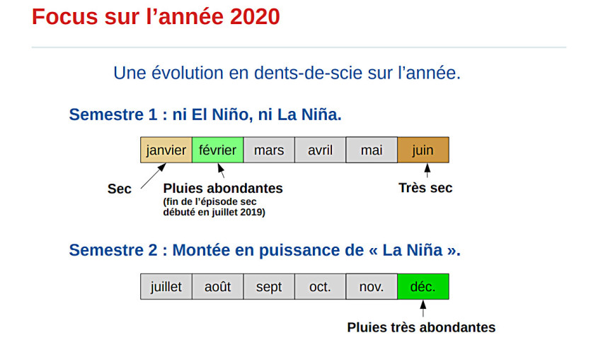 Avec une période de sécheresse jusqu’en janvier et des pluies abondantes dues à La Nina en fin d’année, 2020 est au final dans la normale pour les précipitations. C’est le bilan qu’a présenté ce matin, les équipes de Météo France.