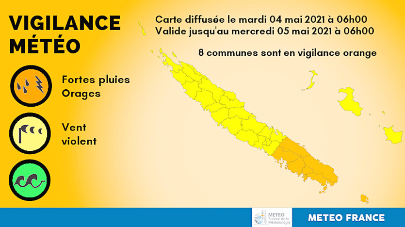 - Jean-Frédéric Gallo | Crée le 04.05.2021 à 10h10 | Mis à jour le 04.05.2021 à 10h10ImprimerHuit communes sont en vigilance orange. Carte Météo-France Nouvelle-CalédonieMétéo-France indique l'Ile des Pins et le sud de la Grande Terre, au sud de Boulouparis et Thio, ont été placés en vigilance orange fortes pluies et vents violents.