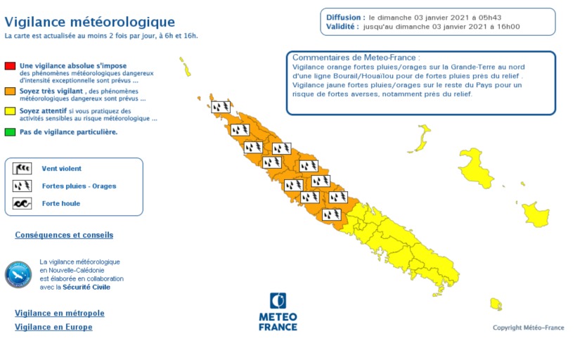 - Brice Bacquet | Crée le 03.01.2021 à 09h40 | Mis à jour le 04.01.2021 à 11h37ImprimerDe fortes pluies sont attendues sur tout le territoire près du relief. Carte Météo Nouvelle-CalédonieLes inondations ne bloquent plus les routes, mais le nord de la Nouvelle-Calédonie reste en vigilance orange.