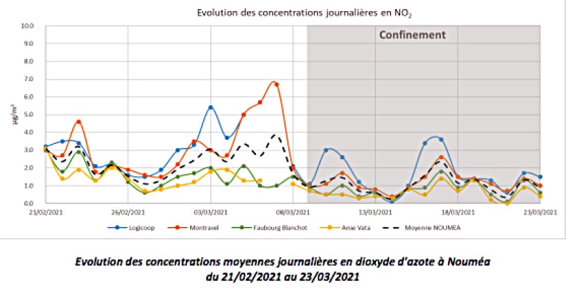Les mesures enregistrées par Scal’Air, depuis la prise d’effet des mesures du deuxième confinement, tendent à montrer encore une fois une diminution des concentrations de dioxyde d’azote, qui est principalement émis par le trafic routier (déplacement professionnel et personnel). Malgré des concentrations déjà très basses, les stations de surveillance de Nouméa enregistrent une diminution des concentrations en NO2 allant de 45 à 62 %, avec une moyenne sur Nouméa qui baisse de 54 % par rapport à la quinzaine précédente.