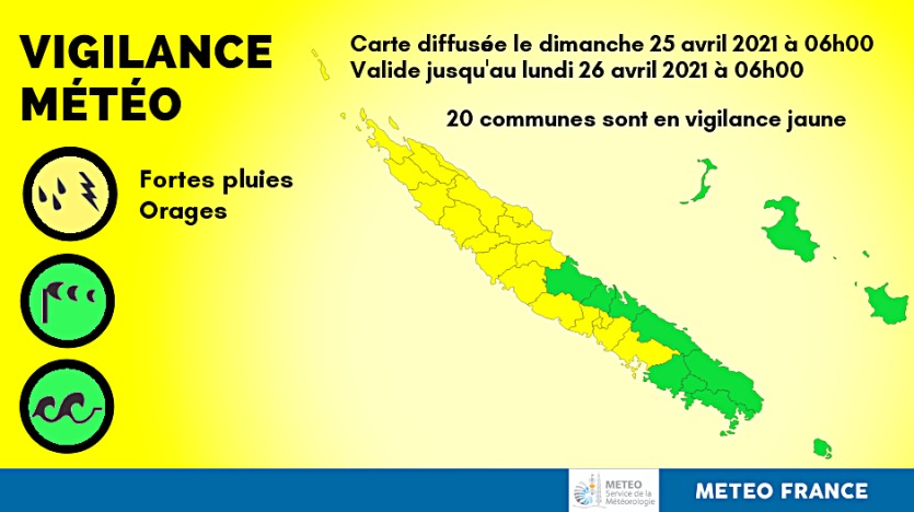 Météo-France Nouvelle-Calédonie appelle à la vigilance. Vingt communes ont été placées en alerte jaune fortes pluies et orages dimanche matin. Cette vigilance concernait le "nord de Boulouparis, Bélep et le Nord-Est au nord de Ponérihouen". Quatorze communes du Nord demeurent à ce seuil d'alerte pour la nuit de dimanche.