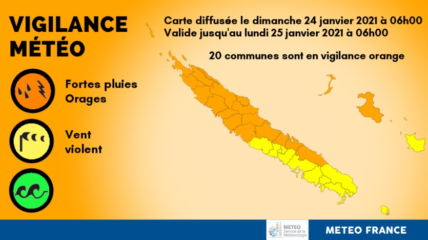 - Brice Bacquet | Crée le 24.01.2021 à 10h20 | Mis à jour le 24.01.2021 à 10h38ImprimerLa vigilance orange ne concerne plus que vingt communes. Carte Météo-France NCLe ciel reste gris au-dessus de la Calédonie ce dimanche. Vingt communes sont placées en vigilance orange par Météo-France NC. La nuit de lundi devrait être plus calme, annoncent les prévisionnistes.