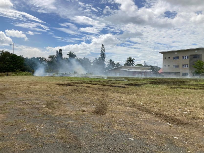 Un du de brousses s’est déclaré à l’arrière des enseignes Nouméa pas cher et Leader Price. Photo Brice Bacquet13h25. La circulation sur la RP1 au niveau de La Conception est fermée dans les deux sens à partir du rond-point de la station Total de Robinson, indique la mairie du Mont-Dore.