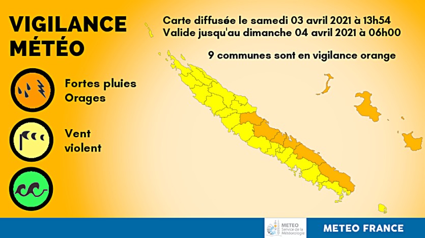 - Brice Bacquet | Crée le 03.04.2021 à 15h55 | Mis à jour le 03.04.2021 à 16h23ImprimerLa vigilance demeure orange sur la côte est et les Loyauté. Carte Météo-France NCLe niveau d’alerte fortes pluies et orages reste orange sur neuf communes de la Grande Terre et des Loyauté. La vigilance sur le reste du territoire passe au jaune.