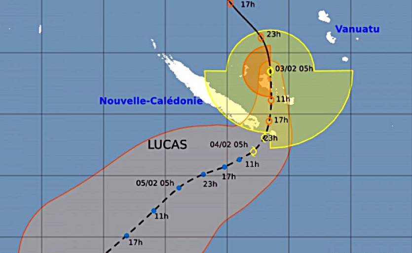 - Tomislav Govekar | Crée le 03.02.2021 à 07h34 | Mis à jour le 03.02.2021 à 07h41ImprimerLa trajectoire probable de la dépression cyclonique Lucas dans les prochaines heures. Source Meteo.ncToute activité devra cesser deux heures avant le passage en niveau 2.