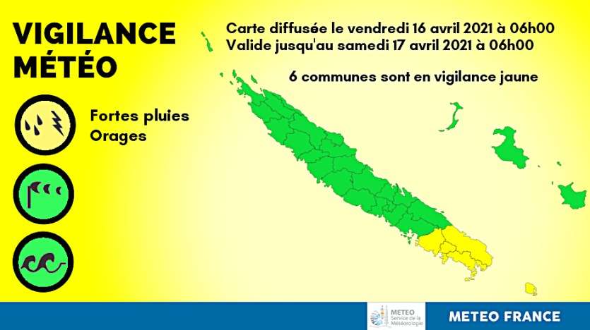 - Lucile Courtot | Crée le 16.04.2021 à 06h50 | Mis à jour le 16.04.2021 à 06h52ImprimerDe fortes précipitations sont encore à prévoir ce matin sur les communes placées en vigilance. Photo Météo France NCAlors que le fort épisode pluvieux de la nuit s’estompe, la vigilance jaune "fortes pluies et orages" est maintenue sur six communes du Sud.