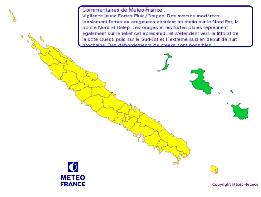 Des averses modérées, localement fortes ou orageuses, circulent ce matin sur le Nord-Est, la pointe Nord et Bélep. Les orages et les fortes pluies reprennent également sur le relief cet après-midi, et s’étendent vers le littoral de la côte Ouest, puis sur le Sud-Est et l’extrême sud en début de nuit prochaine.