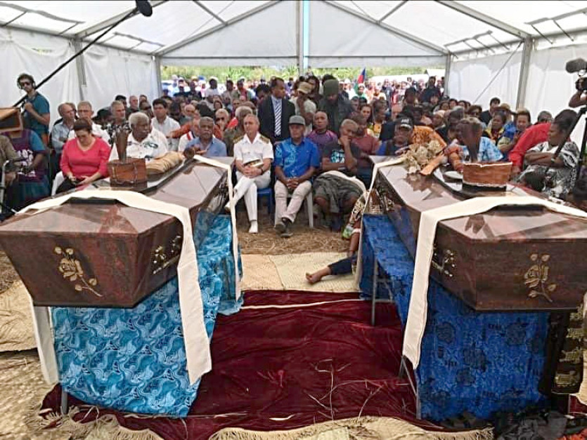Les 2 cercueils ont été sortis de la case, place transitoire, vers l’espace couvert des discours. Avant de rejoindre dans quelques minutes le site funéraire, le caveau. Photo Yann Mainguet