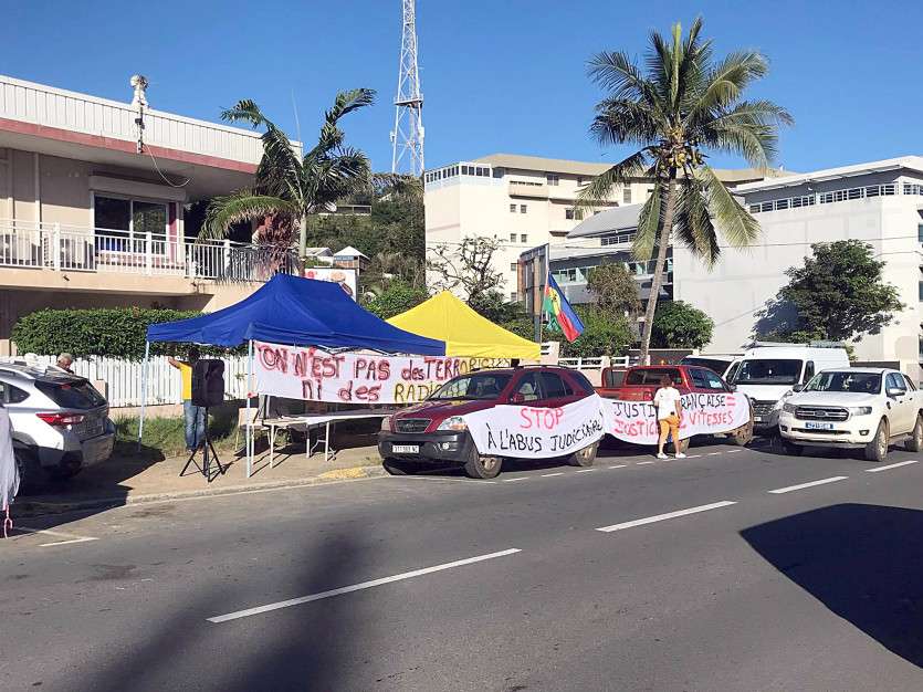 - Jean-Frédéric Gallo | Crée le 07.05.2021 à 08h40 | Mis à jour le 07.05.2021 à 14h39ImprimerPlusieurs dizaines de personnes sont réunies devant le tribunal. Photo J.-A.G.-L.Après 96 heures de garde à vue, Raphaël Mapou, André Vama et cinq autres personnes soupçonnées dans le cadre de l'enquête sur les violences et dégradations autour du conflit de l'usine du Sud, ont été transférées au palais de justice de Nouméa ce vendredi matin.