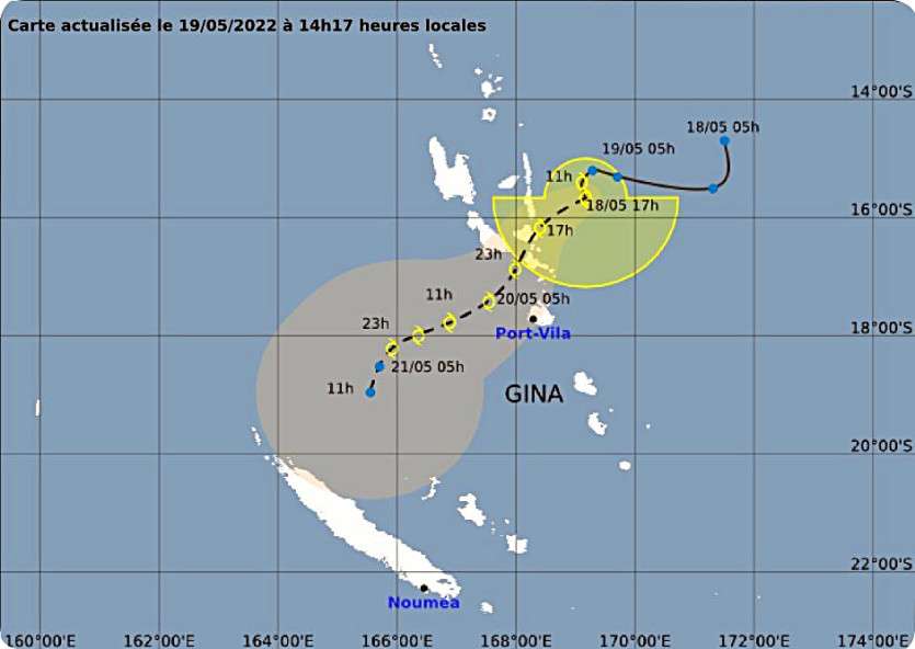 La dépression tropicale Gina se trouve à 240 km au nord-est de Port-Vila. Le phénomène climatique concernera la Nouvelle-Calédonie, vendredi 20 mai. Il va s’approcher du pays en s’atténuant.