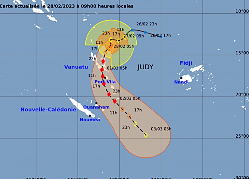 - | Crée le 28.02.2023 à 09h35 | Mis à jour le 28.02.2023 à 09h38ImprimerJudy se renforce. Source Météo FranceCompte tenu de l'incertitude, indique Météo France, les conséquences pour la Nouvelle-Calédonie pourront évoluer en fonction de la trajectoire.