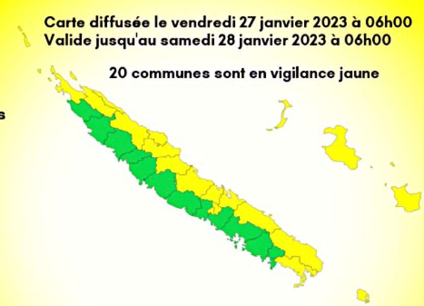 Météo France a placé 20 communes en vigilance jaune fortes pluies et orages. Des averses orageuses reprennent dès la mi-journée sur la chaîne, la façade Est, l’extrême Nord, les Loyauté et l’île des Pins. Des débordements de cours d’eau peuvent survenir. Elles persistent la nuit prochaine aux Loyauté.