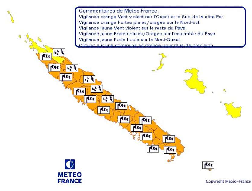 Dans son bulletin de 9 heures, Météo France NC a passé la quasi totalité des communes de Nouvelle-Calédonie en vigilance orange vent violent et/ou fortes pluies et orage.