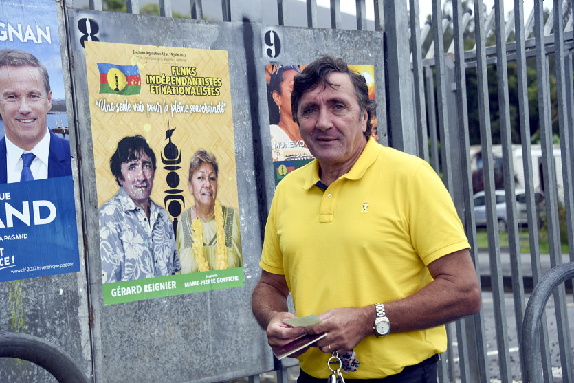 Gérard Reigner devant son bureau de vote, à La Rivière, au Mont-Dore. Photo Thierry PerronA Koné, Gérard Reigner (53,01%) est devant Nicolas Metzdorf (20,06%) et Thierry Santa (16,20%).
