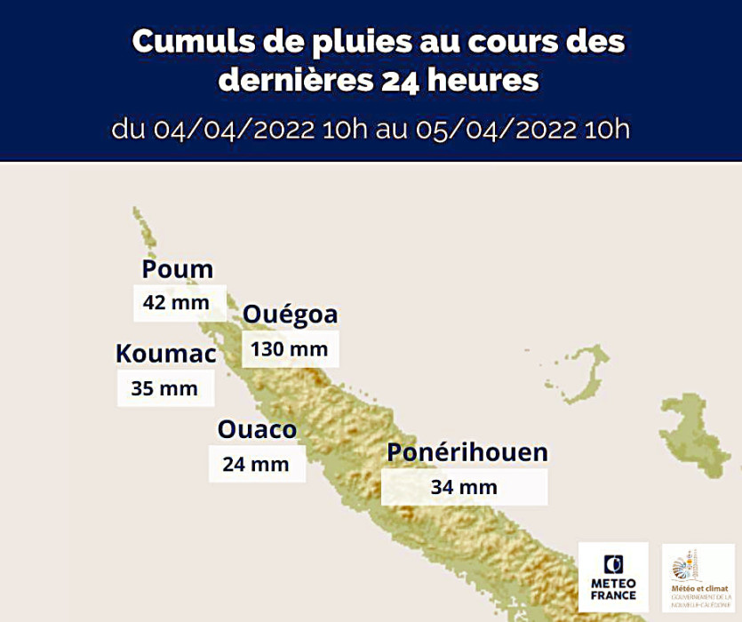 [11h45] Les prévisionnistes l'ont d'emblée annoncé : peu importe l'intensité et la trajectoire de la dépression tropicale 10 F en approche, le phénomène générera de fortes pluies jusqu'à jeudi. Et ce, en particulier sur la côte Est et le Grand Nord, avec par endroits des cumuls qui pourraient atteindre jusqu'à 350, voire 500 mm d'eau. Dans la commune de Ouégoa, Météo France annonce d'ailleurs que déjà 130 mm d'eau ont été enregistrés en 24 heures.