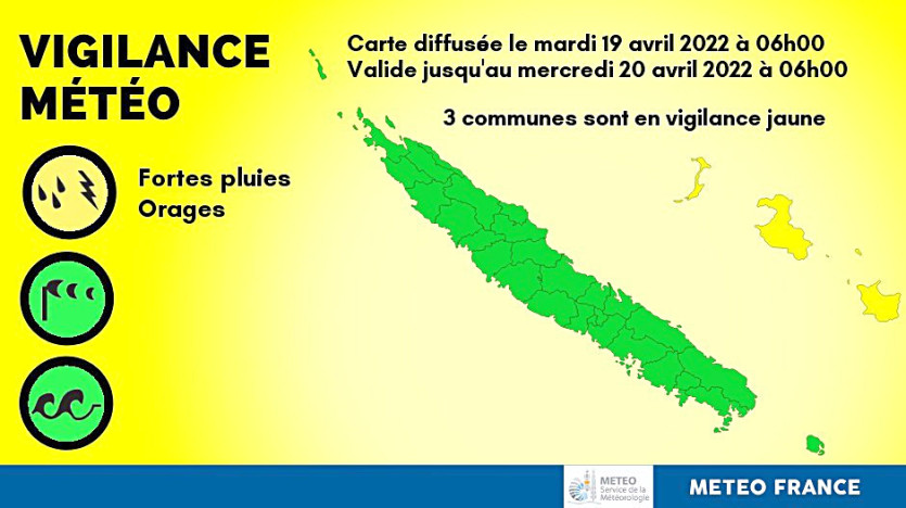- B.B. | Crée le 19.04.2022 à 06h55 | Mis à jour le 19.04.2022 à 07h07ImprimerMétéo-France NC a placé les Loyauté en vigilance jaune. Carte Météo-France NCLes trois communes de Loyautés ont été placées en vigilance jaune orages et fortes pluies. Des "cellules orageuses" seront présentes dès la matinée, mardi 19 avril, annonce Météo-France NC.