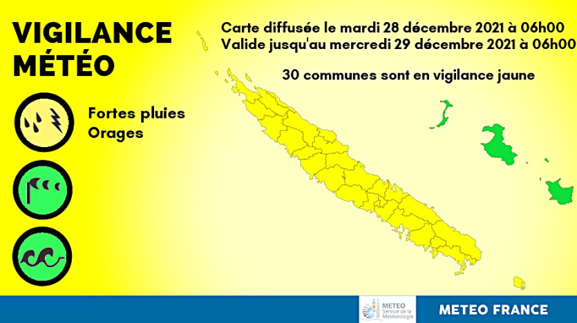 La Grande Terre et Bélep sont placés en vigilance jaune. Carte Météo-France NCToutes les communes sont touchées, sauf les Loyauté. L'"axe pluvio-orageux" menacera le pays jusqu’à la nuit prochaine.