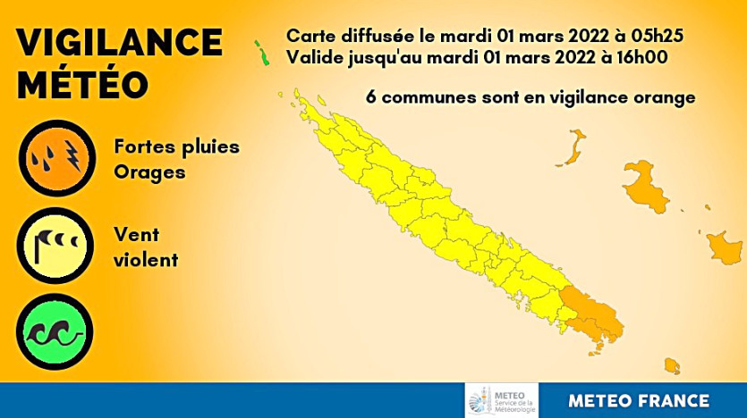 - B.B. | Crée le 01.03.2022 à 06h50 | Mis à jour le 01.03.2022 à 14h54ImprimerMétéo-France NC maintient deux niveaux de vigilance. Carte Météo-France NCQuatre communes du Sud et des Loyauté ont été placées en vigilance jaune, mardi 1er mars. Le reste du territoire, sauf Bélep, reste en alerte jaune orages et fortes pluies.