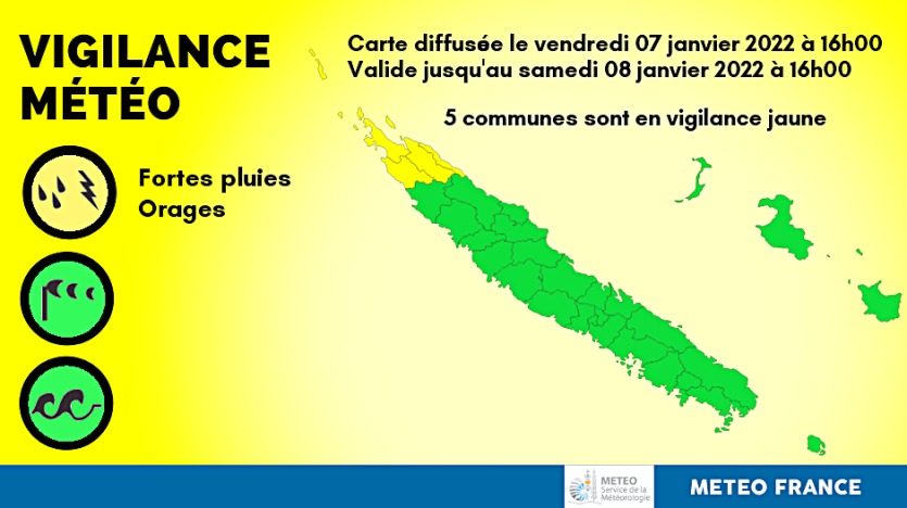 - B.B. | Crée le 07.01.2022 à 16h45 | Mis à jour le 07.01.2022 à 17h00ImprimerLa vigilance jaune est toujours en cours sur cinq communes de la Nouvelle-Calédonie. Carte Météo-France NCCinq communes de la province Nord restent en vigilance jaune fortes pluies et orages. La prudence est toujours de mise.