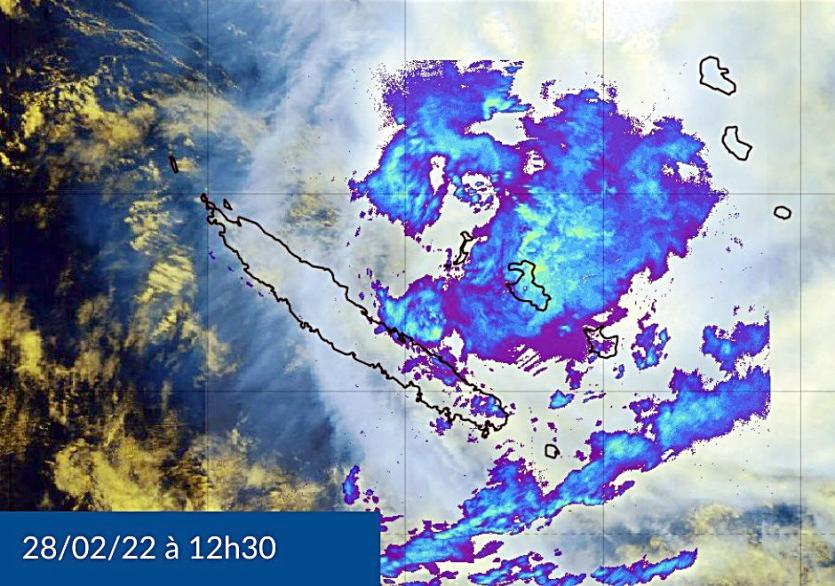 La dépression tropicale faible progresse vers la Grande Terre. Elle atteindra le nord dans la journée du lundi 28 février. "Elle maintient un flux humide sur l’est et le sud, détaille Météo-France NC. Un amas nuageux s’étend des Loyauté au Vanuatu, avec de fortes pluies et des orages. Cet amas se prolonge sur le sud de la Nouvelle-Calédonie où des pluies modérées se produisent."