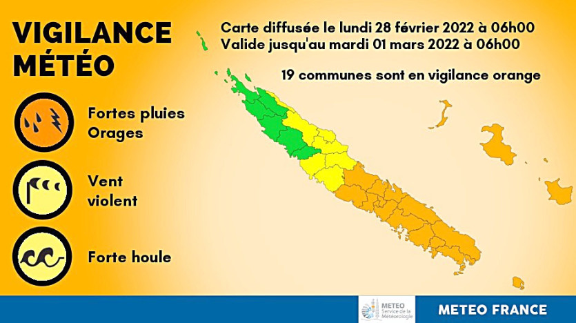 Dix-neuf communes sont en vigilance orange fortes pluies et orages. Carte Météo-France NCDe fortes averses vont toucher au cours de la journée une grande partie de la Grande Terre et des Loyauté. Les communes en vigilance orange sont : Bourail, Moindou, Farino, Sarraméa, La Foa, Boulouparis, Païta, Dumbéa, Mont-Dore, Yaté, Nouméa, Houaïlou, Canala, Kouaoua, Thio, Île des Pins, Ouvéa, Lifou et Maré.