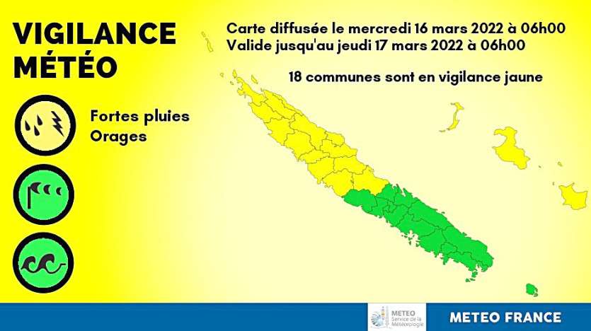 - B.B. | Crée le 16.03.2022 à 07h00 | Mis à jour le 16.03.2022 à 07h19ImprimerLa vigilance jaune orages et fortes pluies concerne les Loyauté et le Nord du pays. Carte Météo-France NCDe fortes pluies et des orages sont attendus dans toute la province Nord et les trois communes des Loyauté. Météo-France NC a placé dix-huit communes en vigilance jaune.