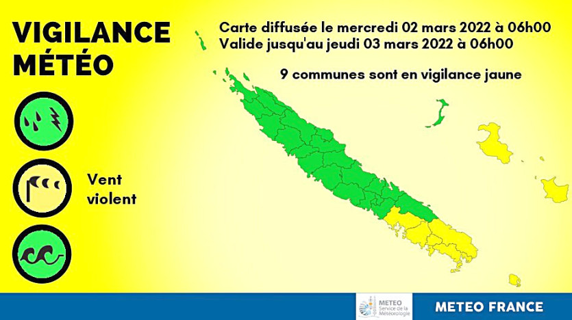 - B.B. | Crée le 02.03.2022 à 06h55 | Mis à jour le 02.03.2022 à 07h02ImprimerNeuf communes du Sud et des Loyauté sont en vigilance jaune vent violent. Carte Météo-France NCMétéo-France NC alerte, mercredi 2 mars, sur l’intensité du vent à Lifou, Maré, l’Île des Pins, Boulouparis, Yaté et dans le Grand Nouméa,