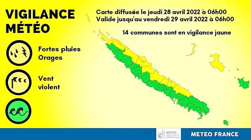 - B.B. | Crée le 28.04.2022 à 06h55 | Mis à jour le 28.04.2022 à 07h10ImprimerUne vigilance jaune est en cours dans quatorze communes. Carte Météo-France NCMétéo-France NC a placé quatorze communes en vigilance jaune, jeudi 28 avril. Des fortes pluies, parfois des vents violents, sont attendues de Bélep à Thio et Lifou et Ouvéa.