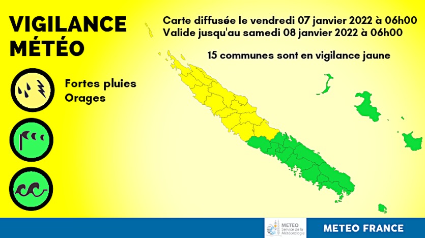 La vigilance jaune reste active sur une grande partie de la province Nord. Carte Météo-France NCLes prévisionnistes ont placé quinze communes de la province Nord en vigilance jaune fortes pluies et orages. L'alerte concerne toutes les communes au-dessus de Houaïlou et Poya. La vigilance est levée sur le reste de la Nouvelle-Calédonie.