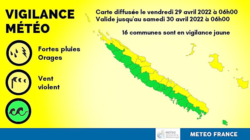 - B.B. | Crée le 29.04.2022 à 09h50 | Mis à jour le 29.04.2022 à 09h56ImprimerSeize communes sont en vigilance jaune vent violent, orages et fortes pluies. Carte Météo-France NCMétéo-France NC a placé seize communes de la côte Est et des Îles en vigilance jaune vent violent, fortes pluies et orages.