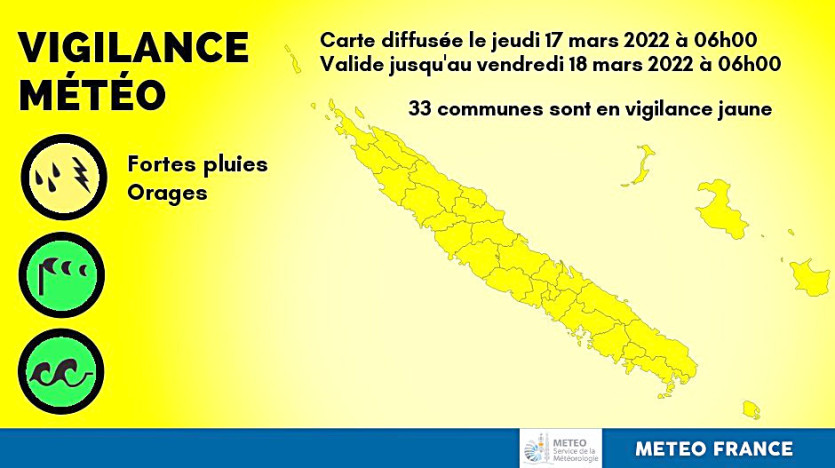- B.B. | Crée le 17.03.2022 à 07h05 | Mis à jour le 17.03.2022 à 07h09ImprimerUne vigilance jaune est en cours sur l’ensemble du pays. Carte Météo-France NCDe fortes pluies et des orages sont attendus sur l’ensemble de la Nouvelle-Calédonie, jeudi 17 mars. Les précipitations touchent le pays en fin de matinée et se renforcent dans l’après-midi.