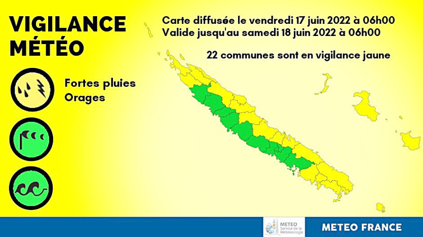 - B.B. | Crée le 17.06.2022 à 07h30 | Mis à jour le 17.06.2022 à 07h40ImprimerVingt-deux communes ont été placées en vigilance jaune par Météo-France NC. Carte Météo-France NCLa pointe Sud, le Nord, la côte Est et les Loyauté ont été placés en vigilance jaune orages et fortes pluies par Météo-France NC. Des averses orageuses sont à craindre dans la matinée, vendredi 17 juin.