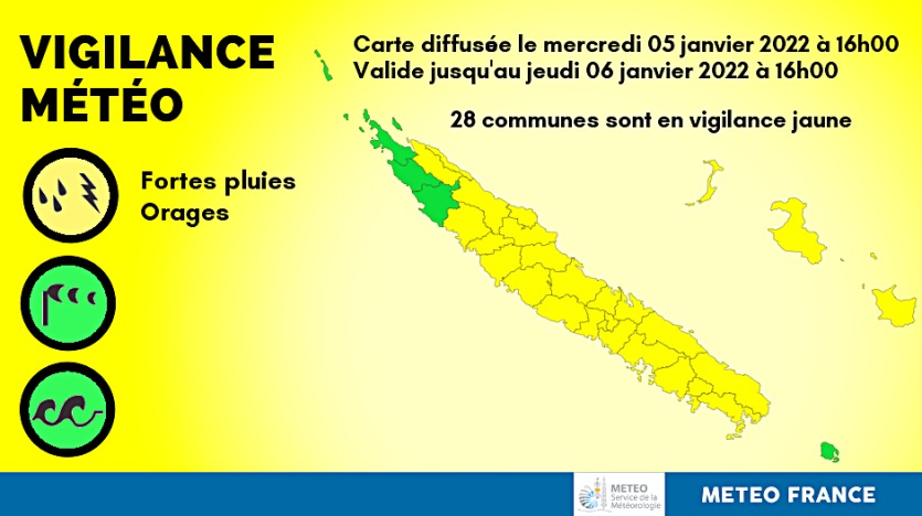 - B.B. | Crée le 05.01.2022 à 09h45 | Mis à jour le 05.01.2022 à 17h28ImprimerÀ Pouembout, des routes sont bloquées avec la montée des eaux. Photo DRUne partie de la Nouvelle-Calédonie reste en vigilance jaune orages et fortes pluies. Météo-France NC a placé vingt-six communes jusqu’à 16 heures, jeudi 6 janvier.