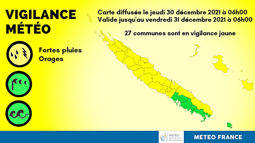 - B.B. | Crée le 30.12.2021 à 07h10 | Mis à jour le 30.12.2021 à 07h17ImprimerLa vigilance jaune fortes pluies et orages est en cours. Carte Météo-France NCLes experts de Météo-France NC ont placé vingt-sept communes de Nouvelle-Calédonie en vigilance jaune. Des orages et pluies modérées sont attendus.