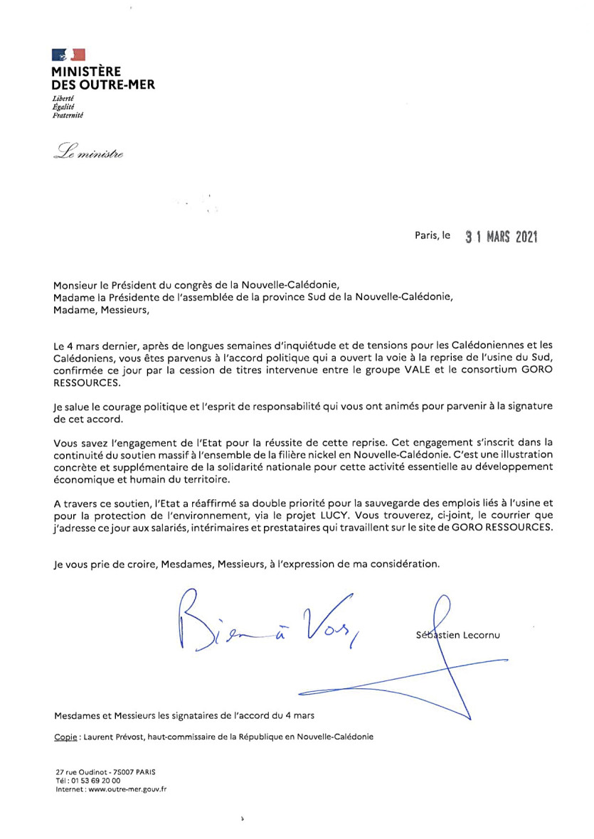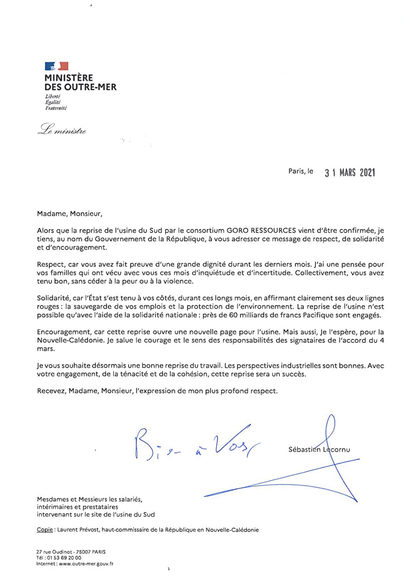 Accueil > Infos en direct > Nouvelle Calédonie > Mines > Nickel > Politique > Sébastien Lecornu s’adresse aux salariés de l’usine du Sud et aux signataires de l’accord du 4 mars
