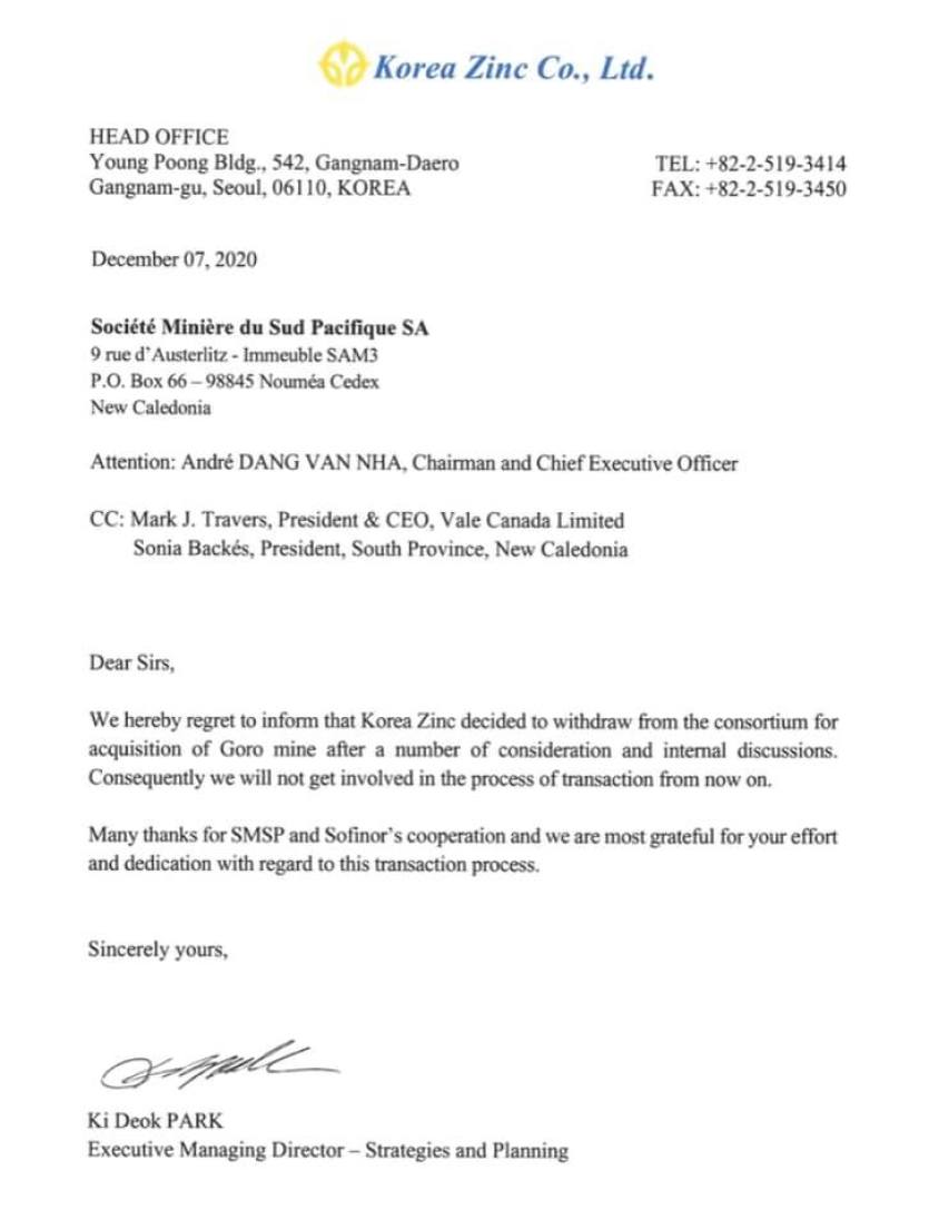 Dans un courrier signé de Ki Deok Park, directeur général exécutif de Korea Zinc, la société coréenne fait part de son retrait du projet de reprise de Vale Nouvelle-Calédonie.