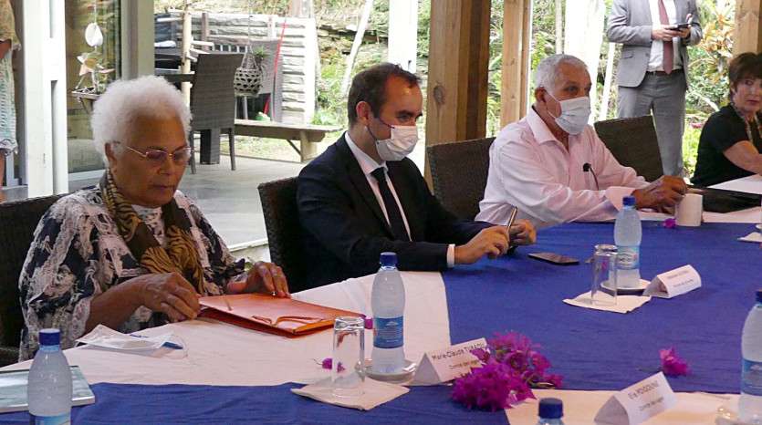 - G. R. | Crée le 15.10.2021 à 17h35 | Mis à jour le 18.10.2021 à 11h29ImprimerSébastien Lecornu, encadré ici de Marie-Claude Tjibaou et Jean-Pierre Aïfa, entame à la discussion avec les membres du comité des sages, au Ka Waboana lodge, à Hienghène. Photo G. R.Le ministre des outre-mer a atterri sur le stade municipal de Hienghène en fin d’après-midi.