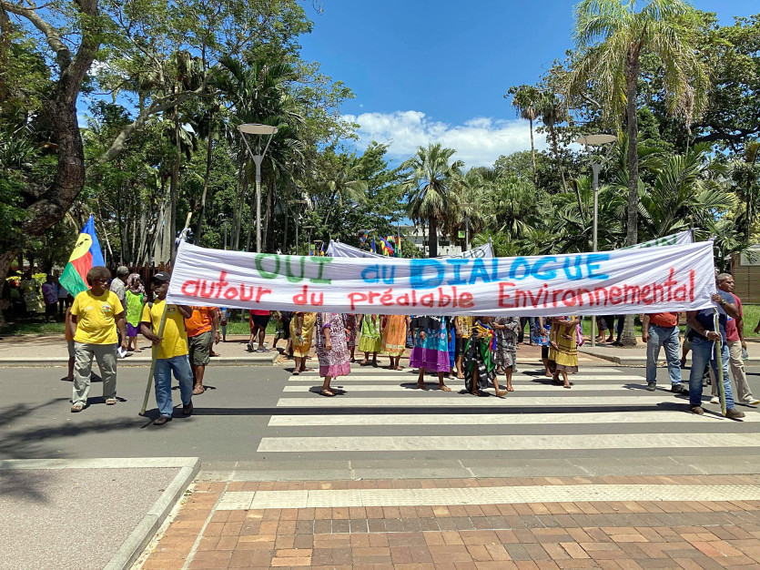 Sous le slogan " Un environnement sain, pour un climat de paix " ou "Oui au dialogue autour du préalable environnement", les militants sont réunis sur la place de la Paix, en face de la mairie de Nouméa. Ils devraient marcher vers la province Sud.