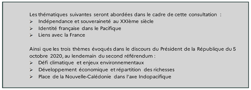 - P. Ch. | Crée le 14.01.2021 à 19h20 | Mis à jour le 14.01.2021 à 19h27ImprimerL’État va organiser une grande consultation qui s’organise autour de cinq axes. Document haut-commissariat de la RépubliqueUne grande consultation de la société civile va être lancée par l'État. Elle va se dérouler parallèlement aux discussions politiques sur l'avenir institutionnel.