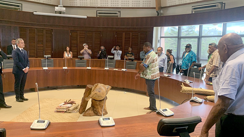 Accueillis par Hugues Vhemavhe, président du Sénat coutumier et autres sénateurs, Gérald Darmanin et Jean-François Carenco se prépare à échanger la coutume de bonjour. Photo J.F.GA l'issue de la cérémonie, les journalistes ont recueillis les premières déclarations du ministre.