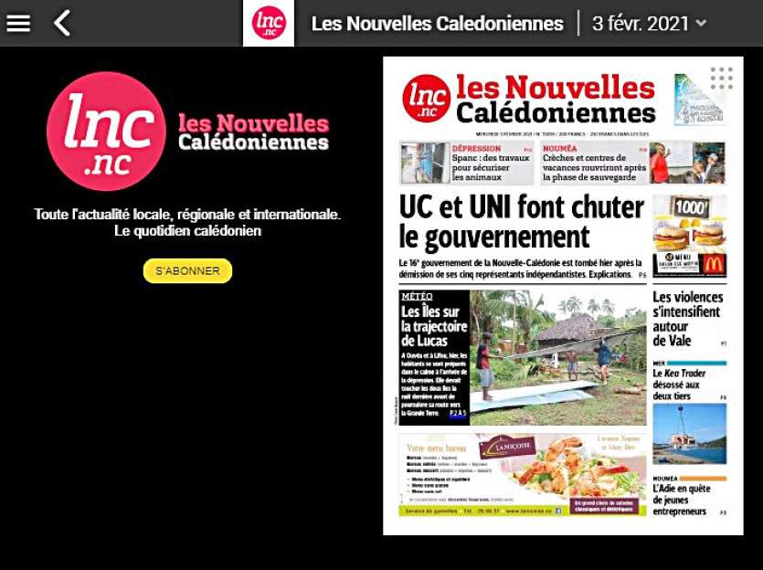 - | Crée le 03.02.2021 à 16h20 | Mis à jour le 03.02.2021 à 17h30ImprimerVue du feuilleteur des Nouvelles calédoniennes sur www.lnc.nc. Photo DRLe journal de ce jeudi 4 février sera disponible gratuitement sur le feuilleteur du site et sur l’application "LNC et ses magazines".