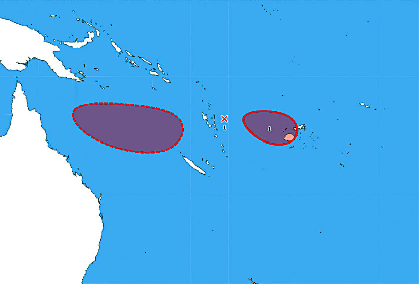 Le risque est également fort de formation d'une dépression tropicale modérée dans cinq à sept jours entre la mer de Corail et Fidji avec encore une grande incertitude sur sa localisation.