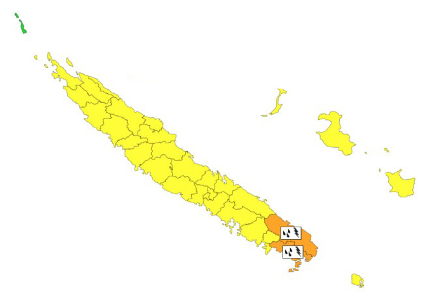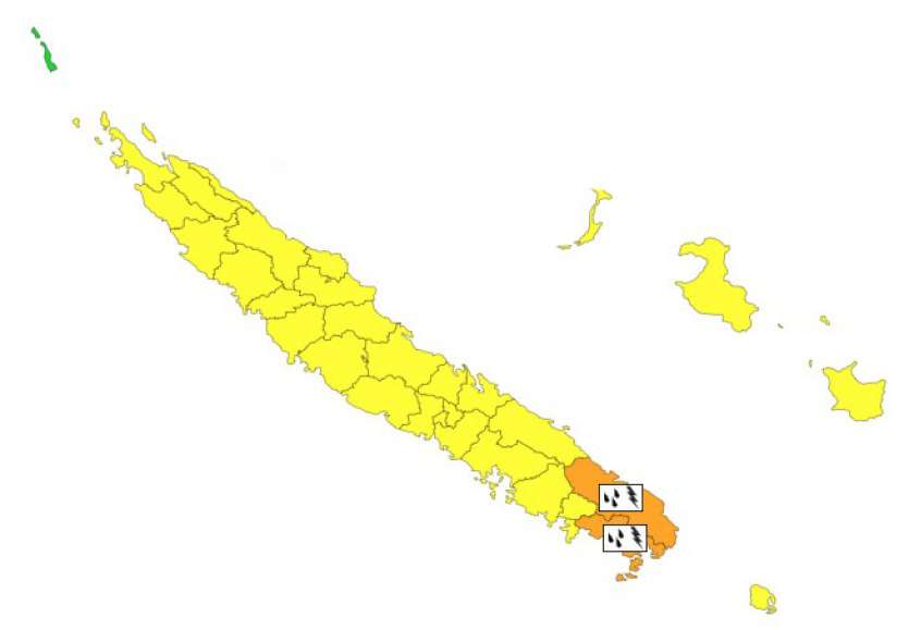 La vigilance des autres communes demeure inchangée.[7h17] Météo France NC a placé l’ensemble des communes du pays, à l’exception de Bélep, en vigilance jaune Fortes pluies/Orages pour des averses orageuses sur les Loyauté et l’extrême Sud dès ce matin, puis également sur le reste de la Grande Terre cet après-midi et en soirée. Le risque est plus faible sur le Sud-Ouest.