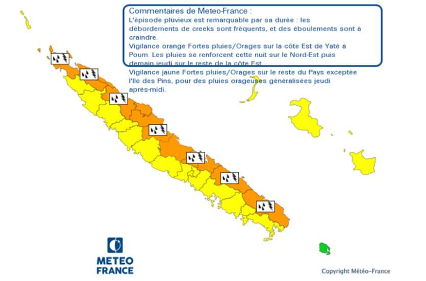 - Tomislav Govekar | Crée le 13.01.2021 à 07h31 | Mis à jour le 13.01.2021 à 16h41ImprimerL'ensemble de la côte ouest est en vigilance orange jusqu'à demain jeudi, 16 heures. Document Météo France NCMétéo France NC indique que cet épisode pluvieux est " remarquable par sa durée : des débordements de creeks sont fréquents et des éboulements ont à craindre ".